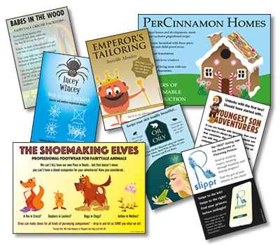 A range of adverts for fairytale products and services to enhance your show programmes.